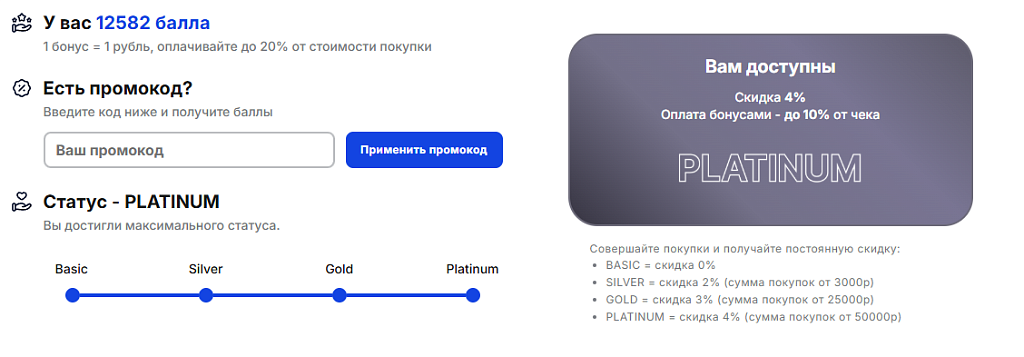 • PLATINUM – скидка 4% (общая сумма покупок от 50 000 рублей).